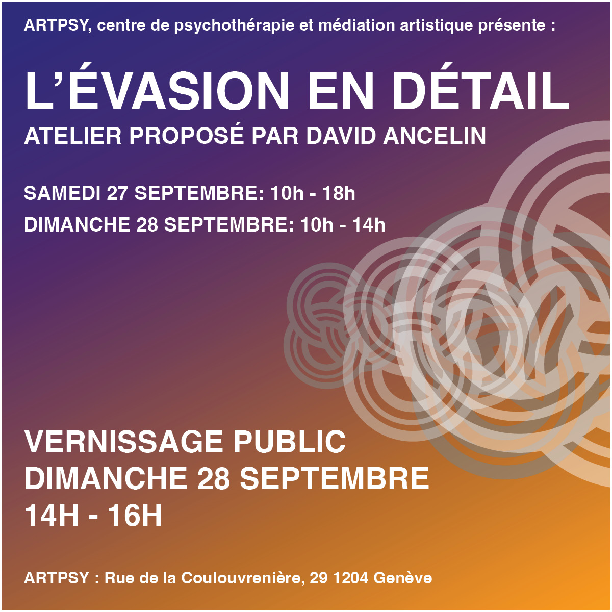 Les 12 et 13 octobre 2024, Artpsy et l’artiste David Ancelin se sont associé pour offrir un atelier artistique inédit au cœur de Genève, au sein du centre de psychothérapie et de médiation artistique. Ouvert à tous les niveaux, cet atelier a proposé une expérience immersive où créativité individuelle et dynamique collective se rencontrent autour d’un thème essentiel : la réappropriation de l'espace public à travers l'art.